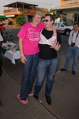 Carol, Louise and breast cancer survivors with ribbons
